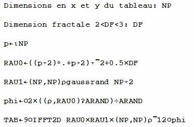 DF est la dimension fractale, gaussrand, une fonction qui crée du bruit gaussien avec ARAND = 231-1. IFFT2D est la fonction de transformée de Fourier inverse sur deux dimensions dont on prend la partie réelle ou imaginaire (9 ou 11○IFFT2D). Enfin -12○phi correspond à exp(i×phi).