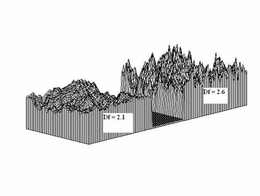 Figure 1. Surfaces fractales générées par FRACT2D. Les éléments aléatoires tels que RAU1 et phi sont les mêmes pour les deux parties de la figure qui ne diffèrent que par leur dimension fractale. Cette figure montre l’effet de cette dimension sur la rugosité d’une surface. On comprend également que l’érosion d’un massif montagneux entraîne la diminution de sa dimension fractale.