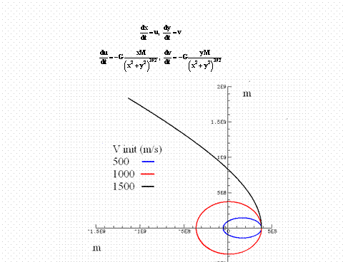 Figure 6. Orbites d’un satellite calculées avec M = 5.98×1024 kG (terre) pour les positions et vitesses initiales x = 3.85×108 m (distance moyenne terre-lune), y = 0, u = 0 et plusieurs valeurs de v. G = 6.673×10-11 m3/kG/s2 est la constante de la gravitation.