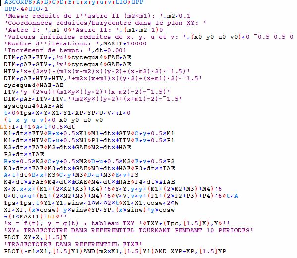 Dans ce cas particulier le calcul de la trajectoire du satellite est effectué par le programme A3CORPS qui résout numériquement un système de quatre équations différentielles par la méthode de Runge-Kutta. Le calcul est effectué en coordonnées réduites et l’échelle de temps est la période de rotation de l’axe x qui joint les deux astres.