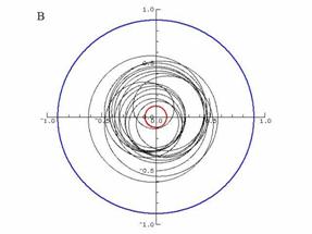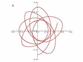 Figure 7. Trajectoires d’un corps de masse négligeable dans le champ gravitationnel de deux astres de masses réduites 0.1 et 0.9 calculées par le programme A3CORPS pour dix périodes de rotation de l’axe joignant les deux astres. A : référentiel tournant, B : référentiel fixe.