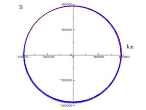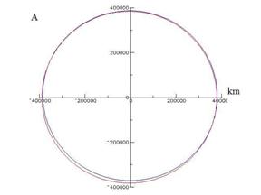 rouge : orbite non perturbée, en bleu : orbite perturbée par le