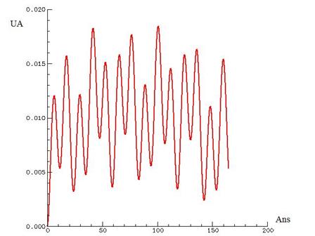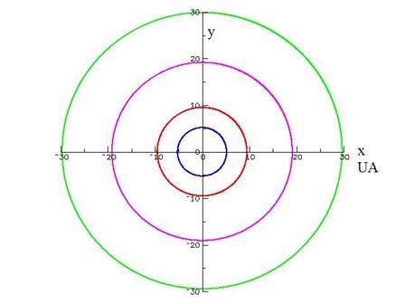 Figure 9. Orbites des planètes géantes calculées par le programme NEWTON5 en tenant compte de toutes les interactions gravitationnelles. UA : unité astronomique, distance moyenne de la terre au soleil soit 1.5×108 km.