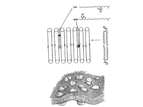 Figure 13. Représentation schématique des doubles couches d’une membrane de phospholipides dans laquelle on insère une sonde d’acide stéarique marqué par un groupe radicalaire ● dont on enregistre le spectre RPE. Selon la position de ce groupe, on peut tester certaines propriétés des doubles couches (polarité, ordre moléculaire, fluidité) pour différentes profondeurs d’immersion de la sonde. La partie inférieure de cette figure est une représentation plus réaliste d’une telle membrane avec des inclusions de protéines.