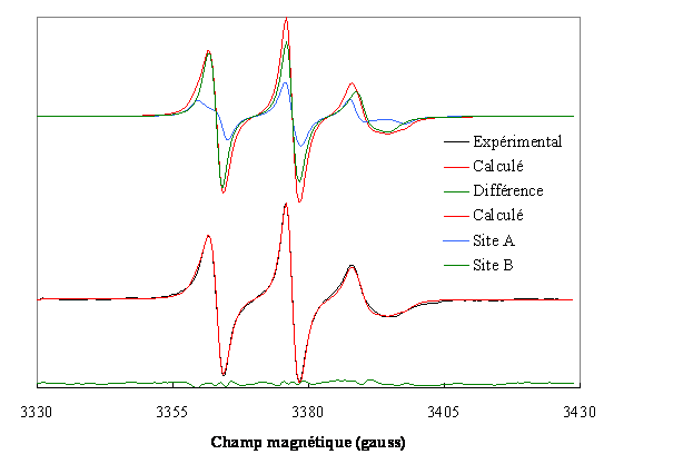 Figure 14. Spectre RPE d’une sonde radicalaire dans une membrane contenant du cholestérol. La dérivée d’absorption du rayonnement micro-onde est tracée en fonction du champ magnétique appliqué. Le diagramme inférieur comporte le spectre expérimental, le spectre simulé après optimisation des paramètres et leur différence. Le diagramme supérieur indique que le spectre simulé est la somme de deux spectres correspondant respectivement aux domaines enrichis en cholestérol, les mieux ordonnés (site A, 38%, S = 0.279) et aux domaines désordonnés (site B, 62%, S = 0.141) dépourvus de cholestérol. Le principe de ces simulations est exposé dans la réf. [1].